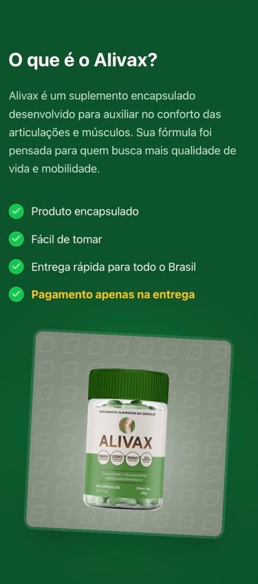 Alivax é um suplemento encapsulado desenvolvido para ajudar no conforto das articulações e músculos, trazendo mais mobilidade para o seu dia a dia.